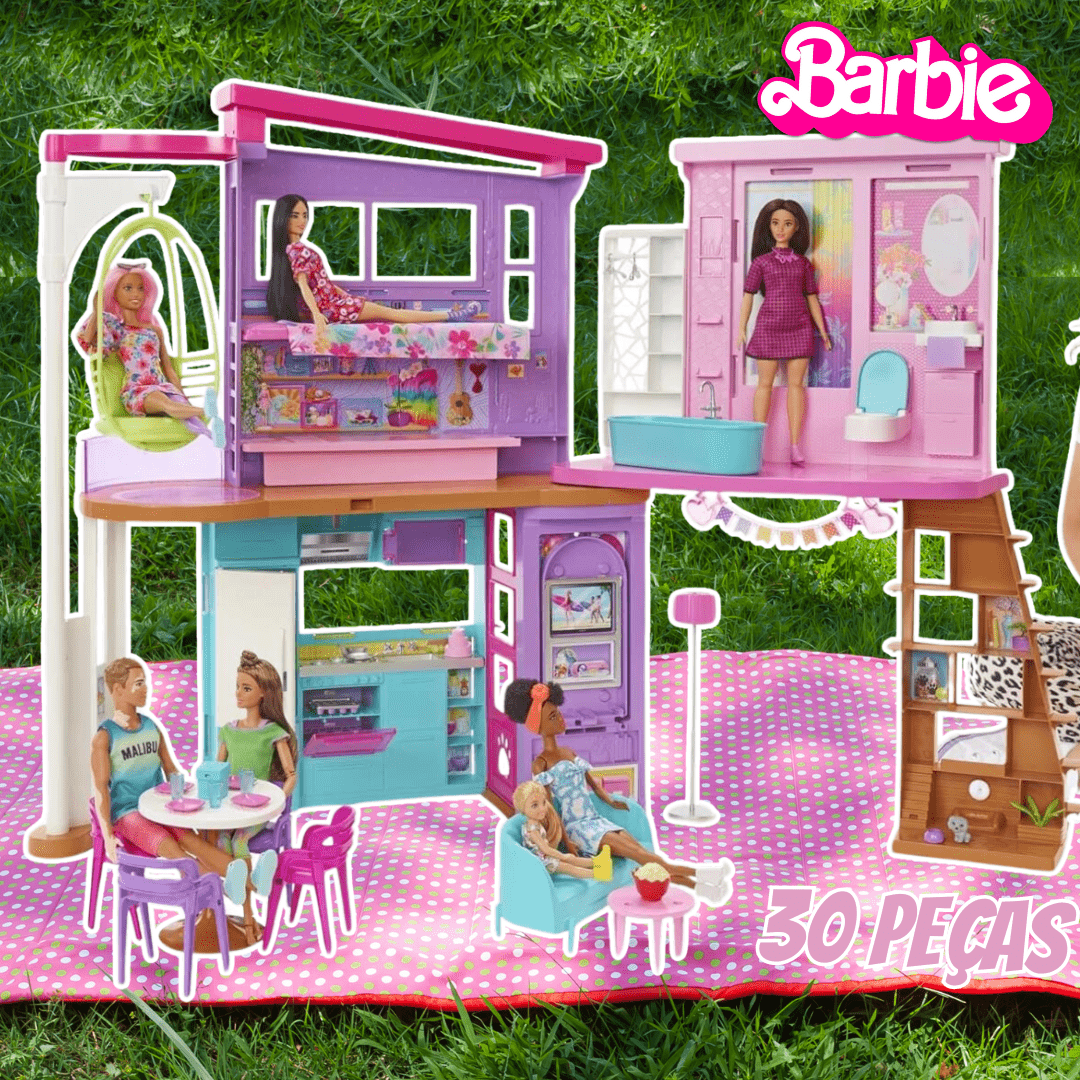 ✅ Barbie, Casa de Bonecas Malibu com 2 andares, 6 Áreas para Brincar e Mais de 30 peças
