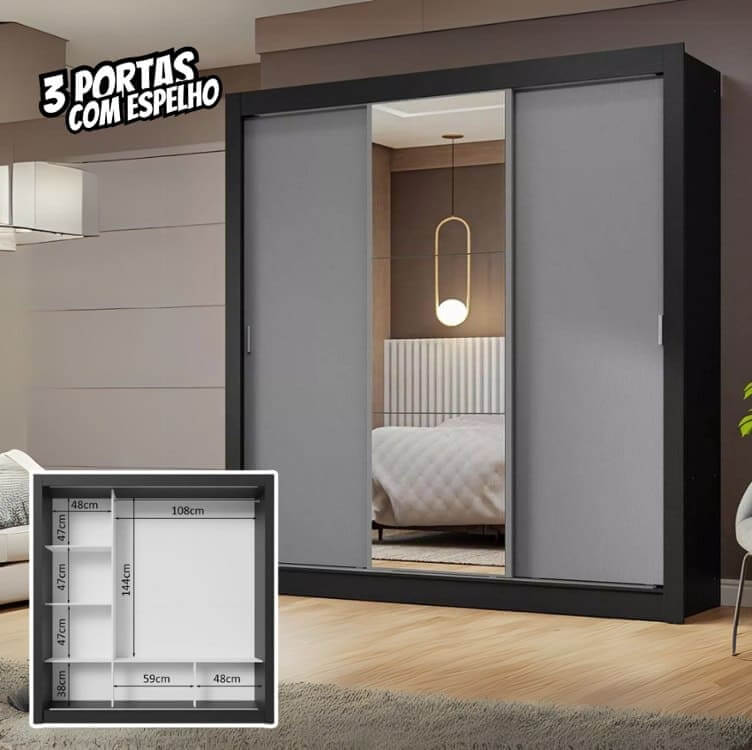 Guarda-roupa Casal 3 Porta Correr C/ Espelho Nobre Madesa Pc Cor Preto/Cinza