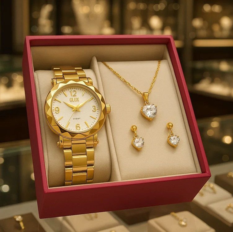 Relógio Feminino Analógico + Colar Brincos Folheado Ouro 18k