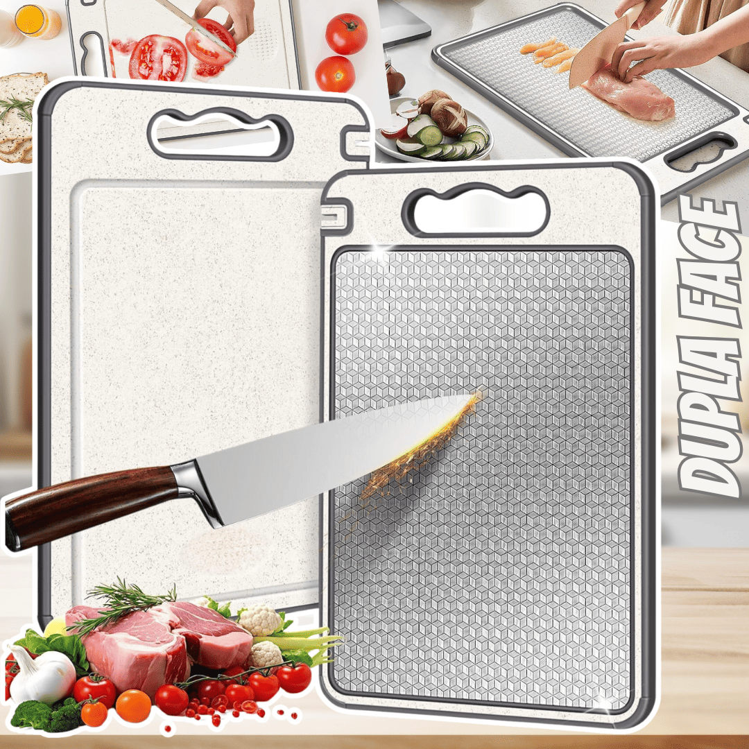 Tábua de Corte Cortar Dupla Face Higiênica e Saudável para Cozinha em Aço Inoxidável e PP para Carnes, Frutas e Vegetais com Afiador Integrado